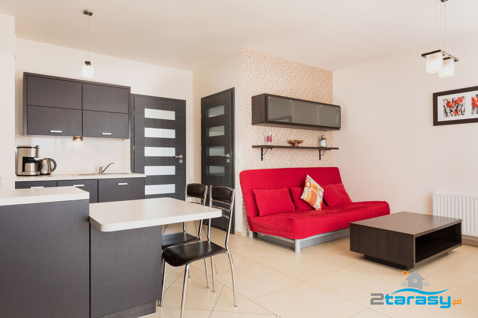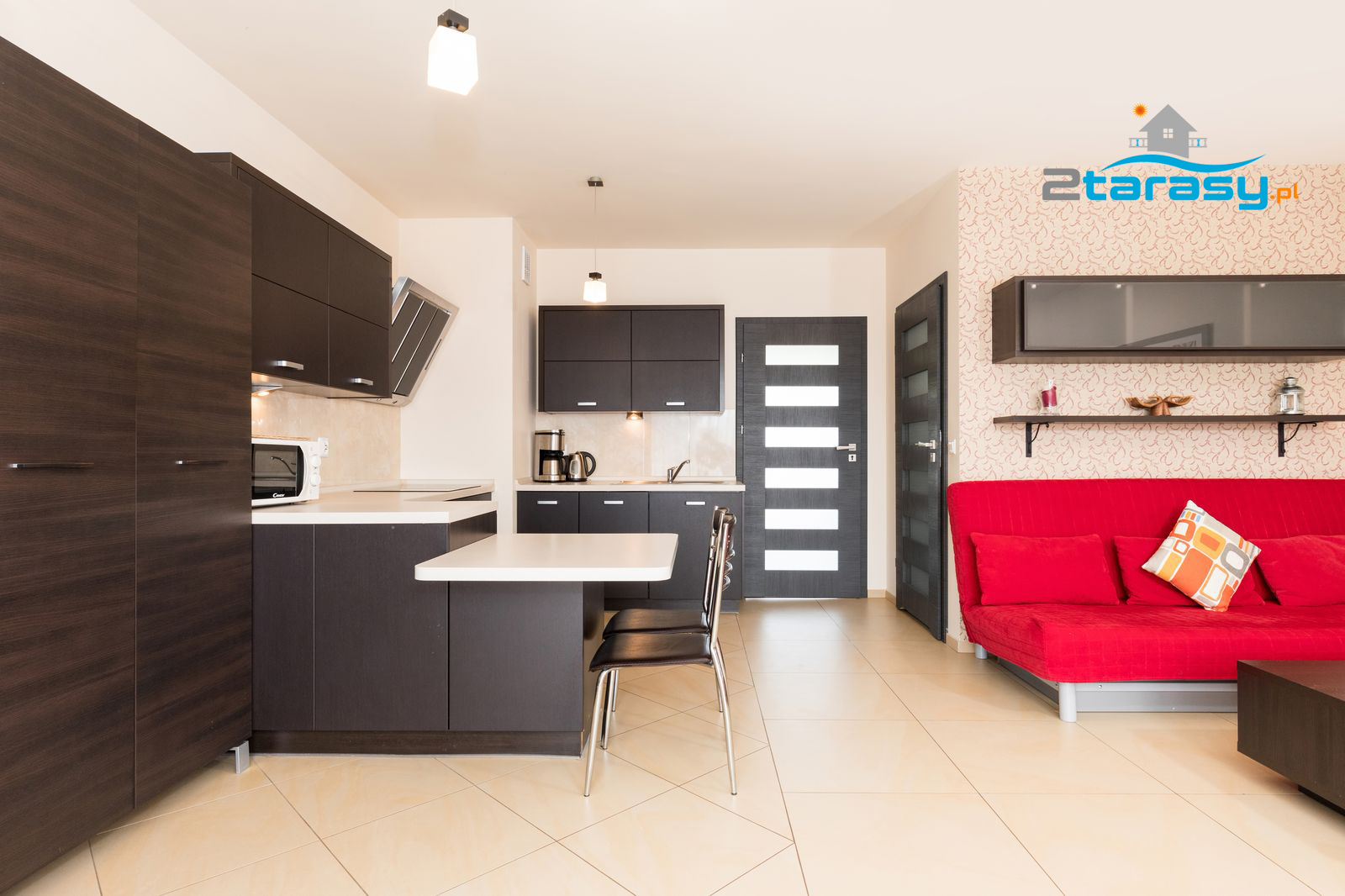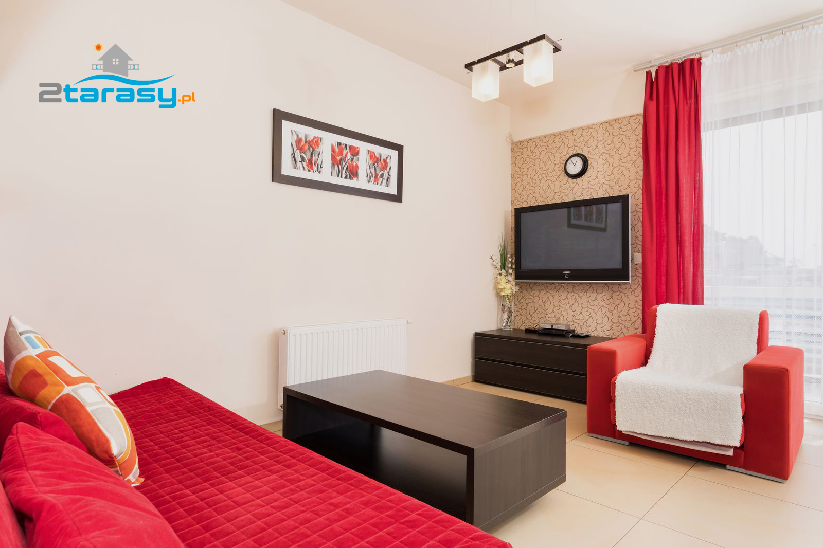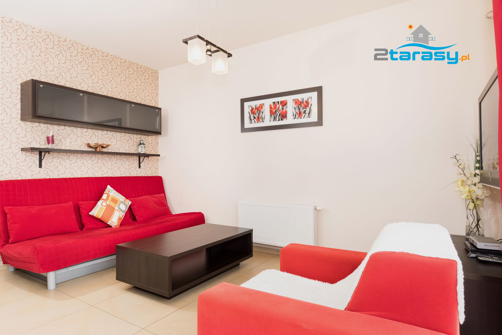 Do dyspozycji gości nowocześnie zaaranżowane wnętrza o pow. 50 m2: salon z balkonem, aneks kuchenny, sypialnia, łazienka z prysznicem no i 2 tarasy :)